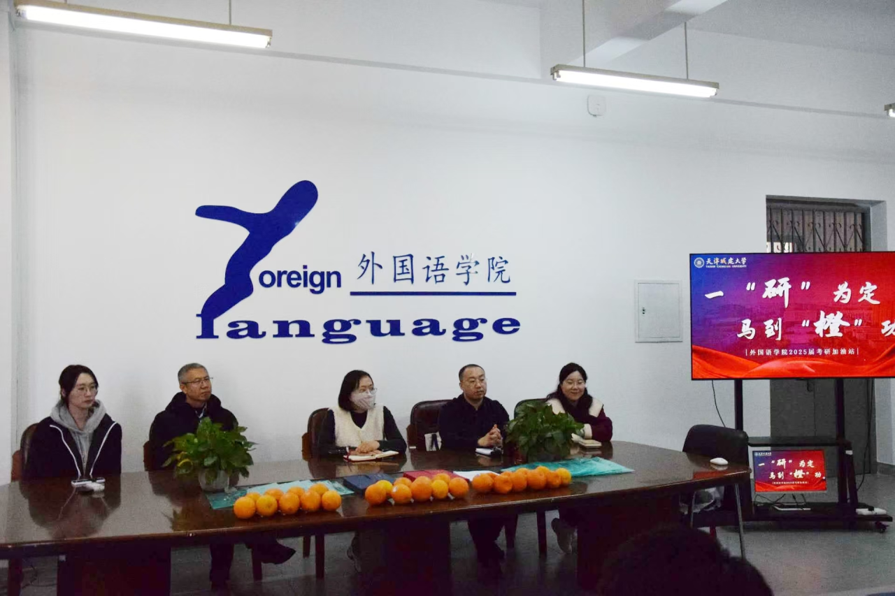笔耕寒夜志如磐,暖心助梦待凯旋。考研的脚步日益临近,为帮助考研学子缓解备考压力,增强考试信心,外国语学院于12月16日在文法楼403举办“一“研”为定 马到“橙”功”考研加油活动。学院党总支副书记赵乾、2025届毕业生班主任出席本次活动,毕业生辅导员与考研学子共同参与。