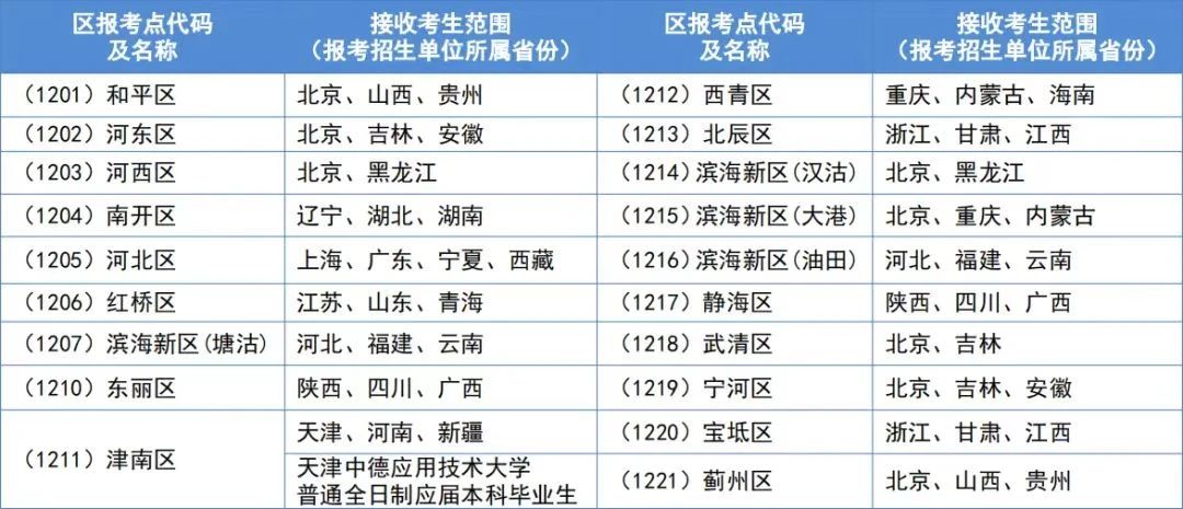 5.区报考点分别是和平区、河东区、河西区、南开区、河北区、红桥区、东丽区、津南区、西青区、北辰区、滨海新区(塘沽)、滨海新区(汉沽)、滨海新区(大港)、滨海新区(油田)、静海区、武清区、宁河区、宝坻区、蓟州区的教育招生考试中心。高校报考点以外的其他考生,按照报考招生单位所属省份选择19个区报考点。为提升考试组织管理的安全性和规范化水平,报考同一招生单位考生的报考点相对集中。报考点具体安排,依据往年各招生单位报考人数与各报考点承载量确定。因报考点的标准化考场数量限制,如考生遇到报考点已满额的情况,可另选其他未满额的报考点。所有符合我市报名条件的考生均可保障考位。